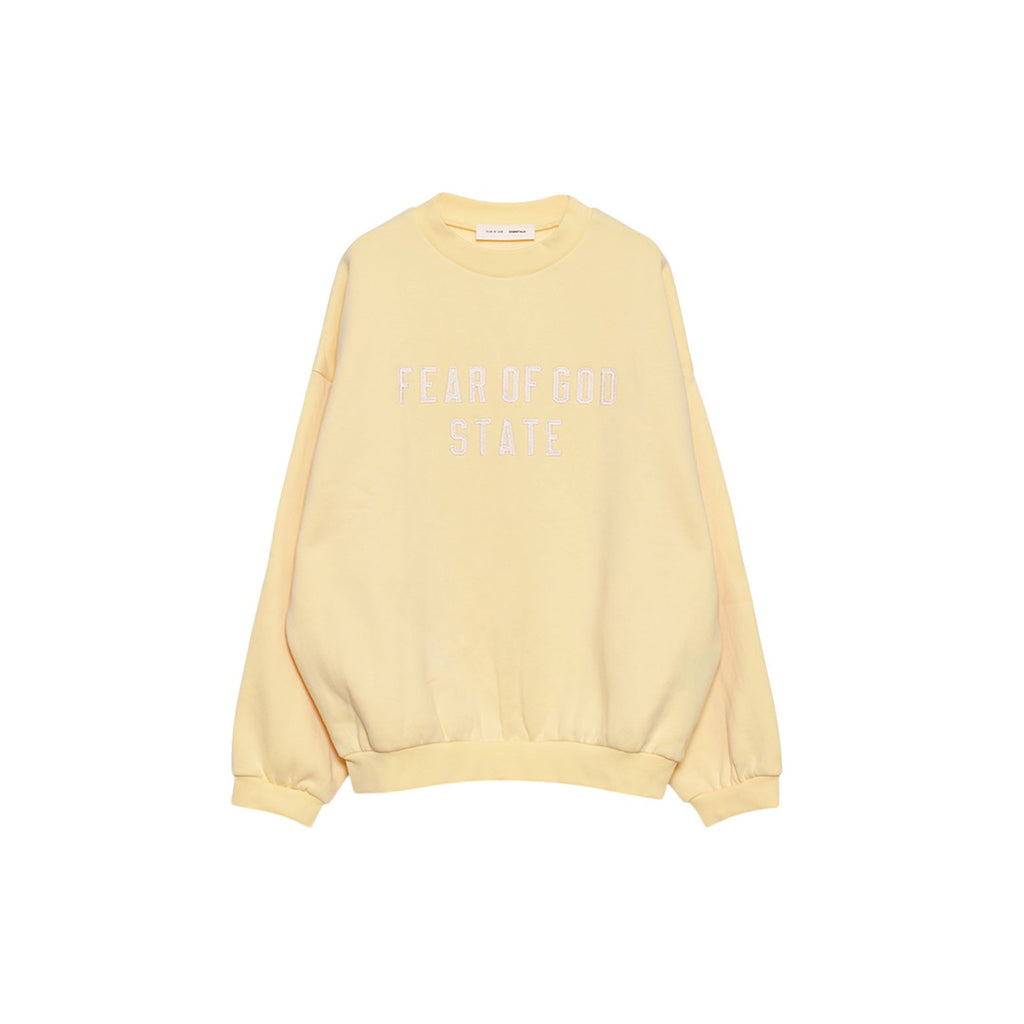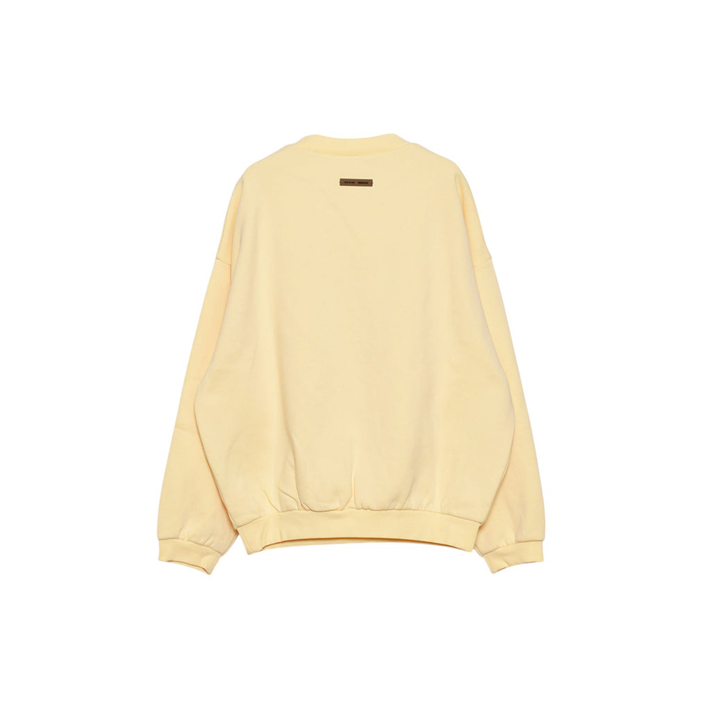 The 90's Crewneck Sweatshirt in Garden Yellow by Fear of God Essentials is made from heavyweight cotton-polyester fleece with a density of 380 gsm, offering both comfort and structure. It has a 90s fit with oversized proportions and dropped shoulders, creating a relaxed, vintage-inspired silhouette. The front features branded "Fear of God" lettering in satin twill, and a translucent rubberized label from the Fear of God label at the back of the collar. Rib knit collar, cuffs, and waist hem finish the design, combining classic details with modern comfort.