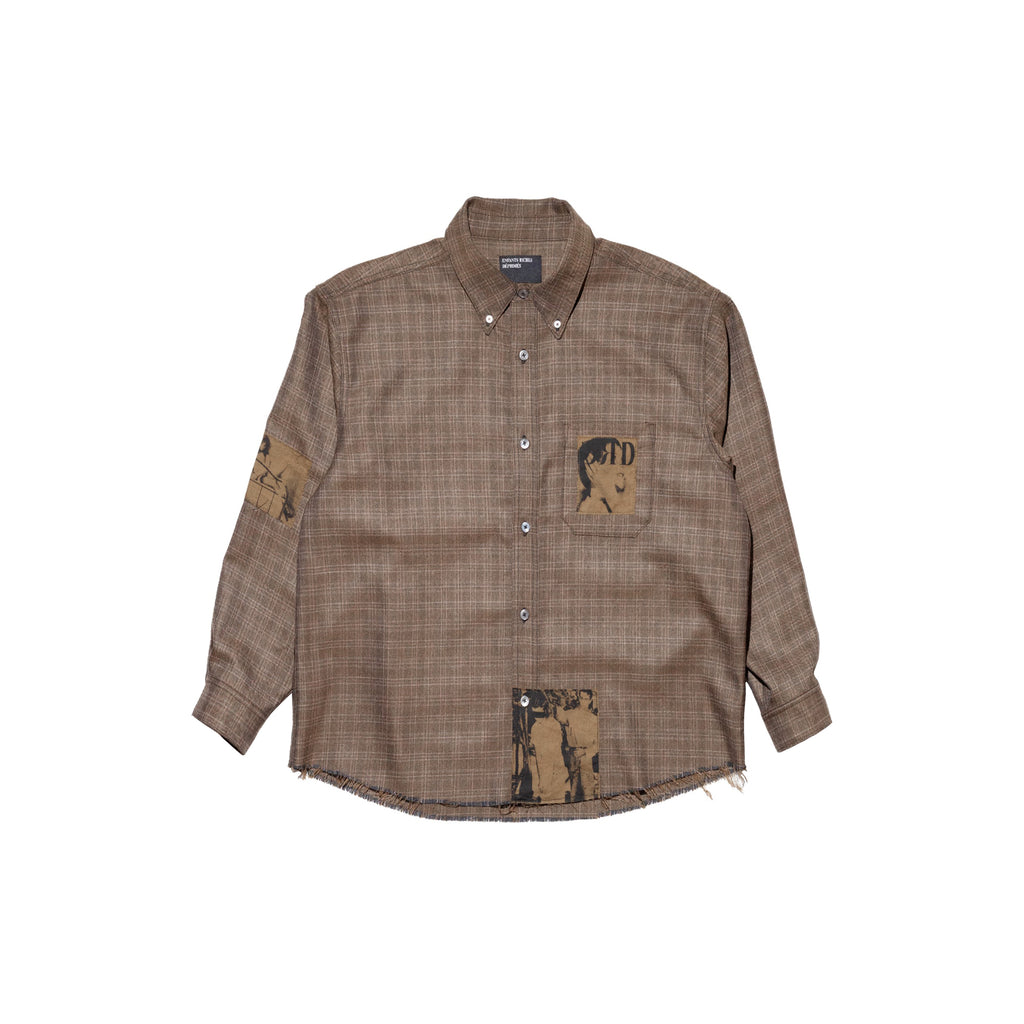 The Assemblage Flannel (Brown) from Enfants Riches Déprimés is a button-down shirt crafted from premium Italian virgin wool, offering both comfort and refined structure. Printed artwork patches are applied throughout, giving the piece a distinct, deconstructed aesthetic that reflects the brand's avant-garde identity. Made in the USA, this flannel blends luxury materials with expressive detailing for a look that is bold, elevated, and unmistakably individual.