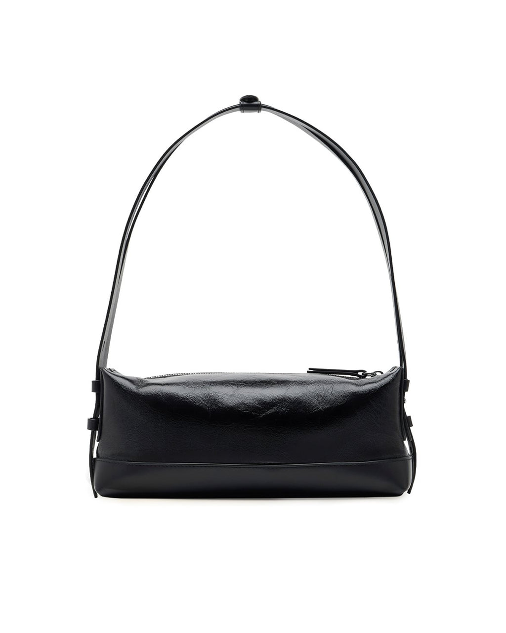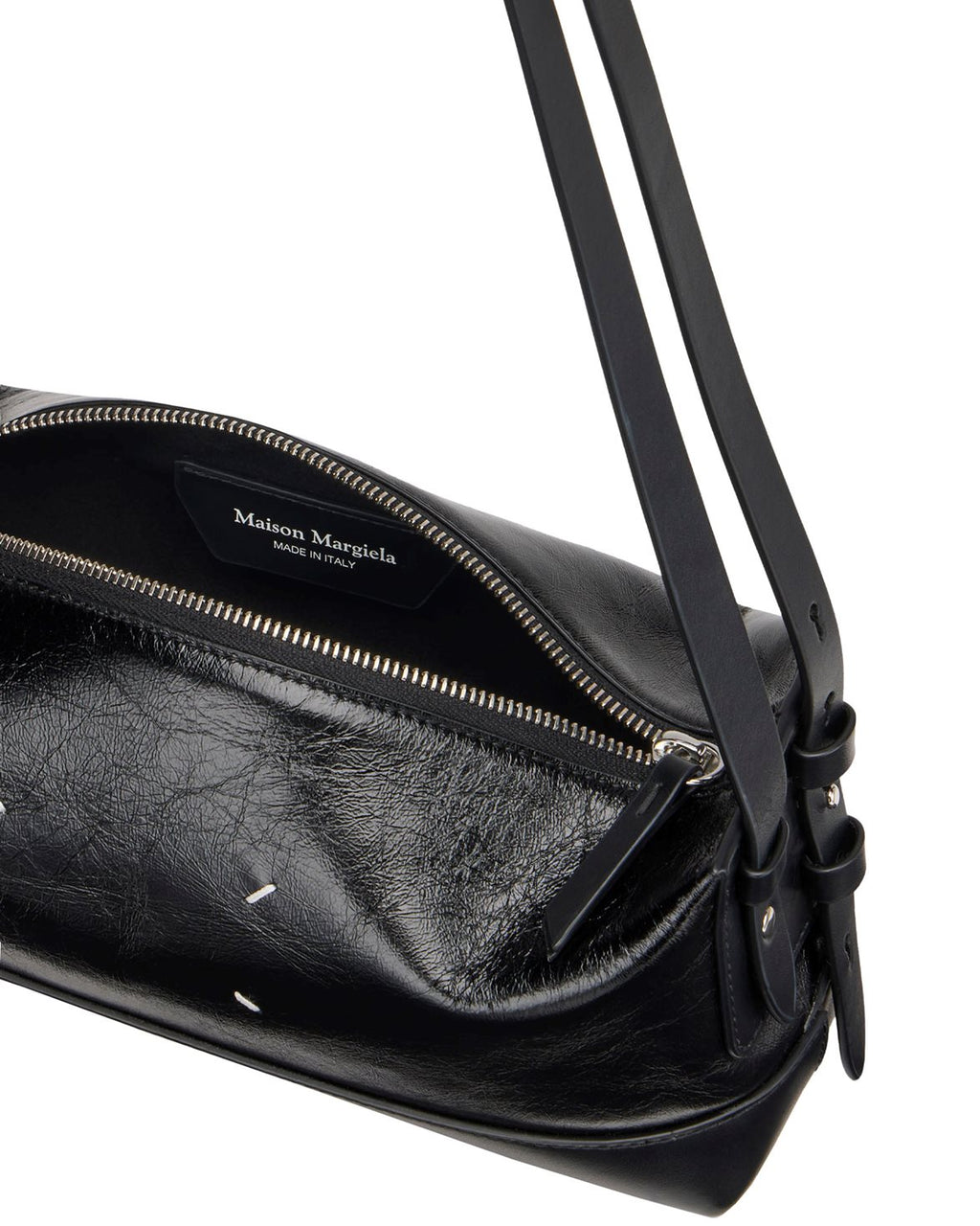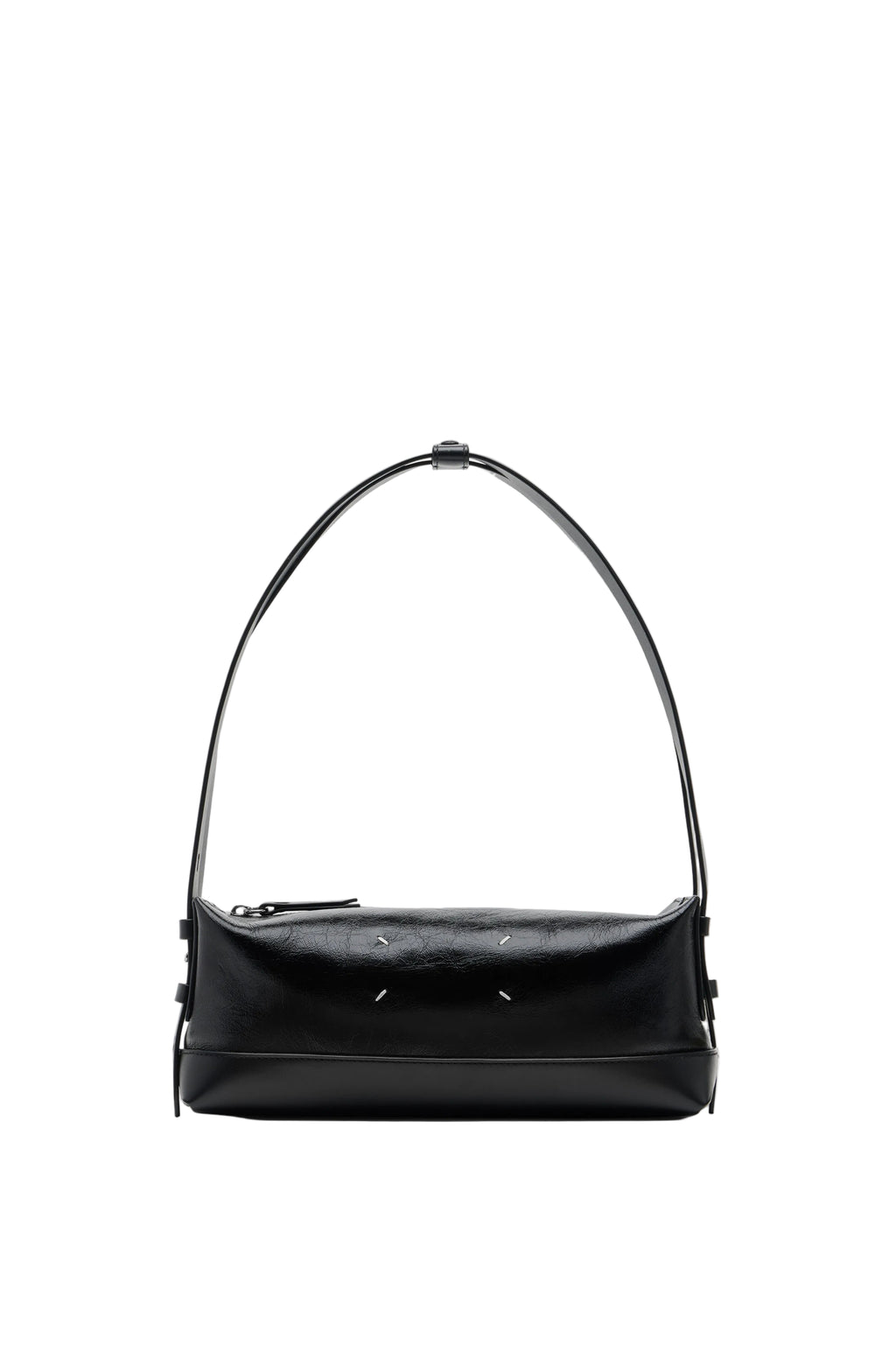 The Baguette Small Shoulder Bag by Maison Margiela is crafted in Italy from wrinkled glossy leather combined with smooth calf leather, creating a refined yet distinctive finish. Designed with a compact, structured silhouette, the bag features a metallic zip closure that adds a functional and modern touch. Belted top handles and adjustable shoulder straps with buckle detailing allow for versatile wear. Maison Margiela's iconic four stitches, the opposite of a label, appear on the front and back, while a logo application on the front, and an interior logo stamp, subtly complete the design.