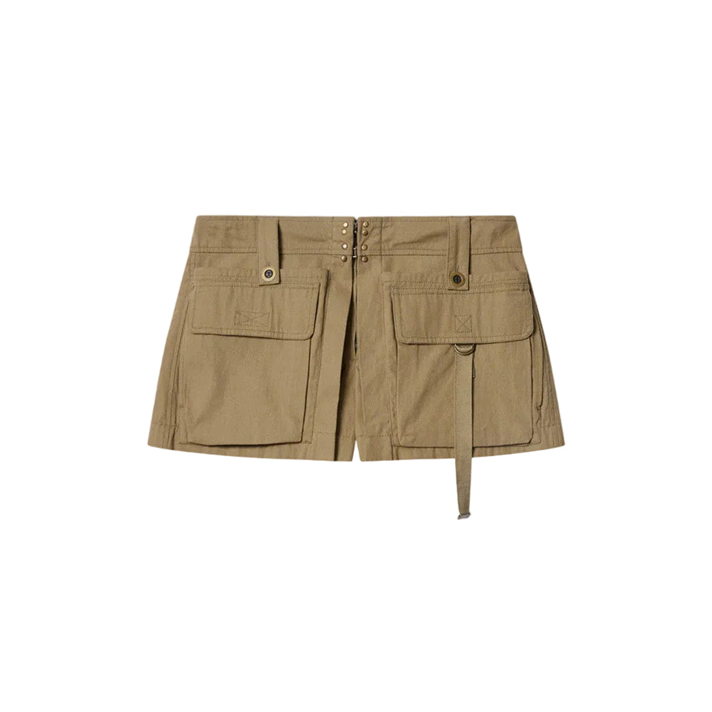 The Barta Shorts by Isabel Marant are a reinterpretation of classic utility wear in a modern, feminine way. Crafted from cotton, these shorts feature a flared silhouette that balances structure and ease. They fasten at the front with a zipper and two bronze metal hooks. Double cargo pockets with flaps on the front and piped buttoned pockets on the back add to the functional aesthetic. Wide buttoned loops on the waistband and a tone-on-tone grosgrain strap complete the look. This is a refined take on a contemporary utilitarian style.