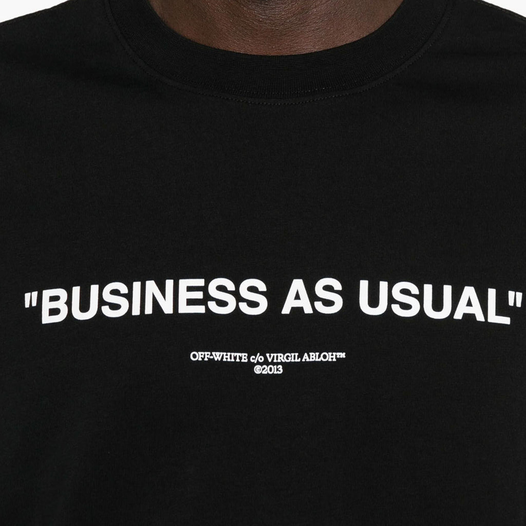 The Business Quote Skate Short Sleeve Tee in black and white from Off-White™ embodies a minimalist design with a conceptual twist. Crafted from premium soft cotton, it offers a relaxed fit and everyday comfort, highlighted by the bold "BUSINESS AS USUAL" slogan printed across the chest in contrasting white. The back remains clean and unadorned, reinforcing the tee's understated aesthetic, while the ribbed crewneck and precise finishing showcase the brand's commitment to quality. Balancing subtle branding with contemporary style, this T-shirt is a versatile piece that effortlessly complements any modern wardrobe.
