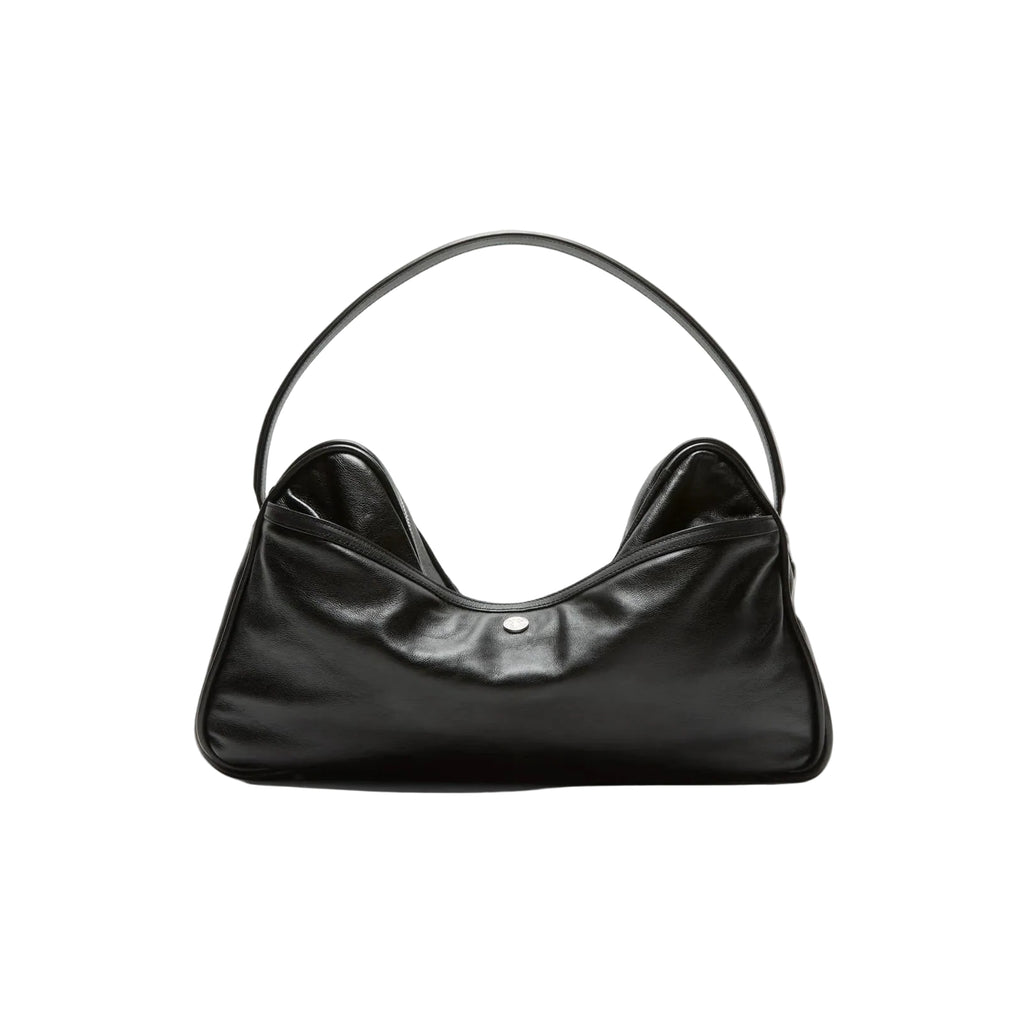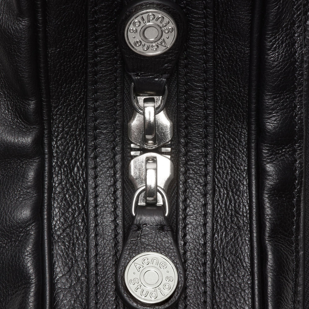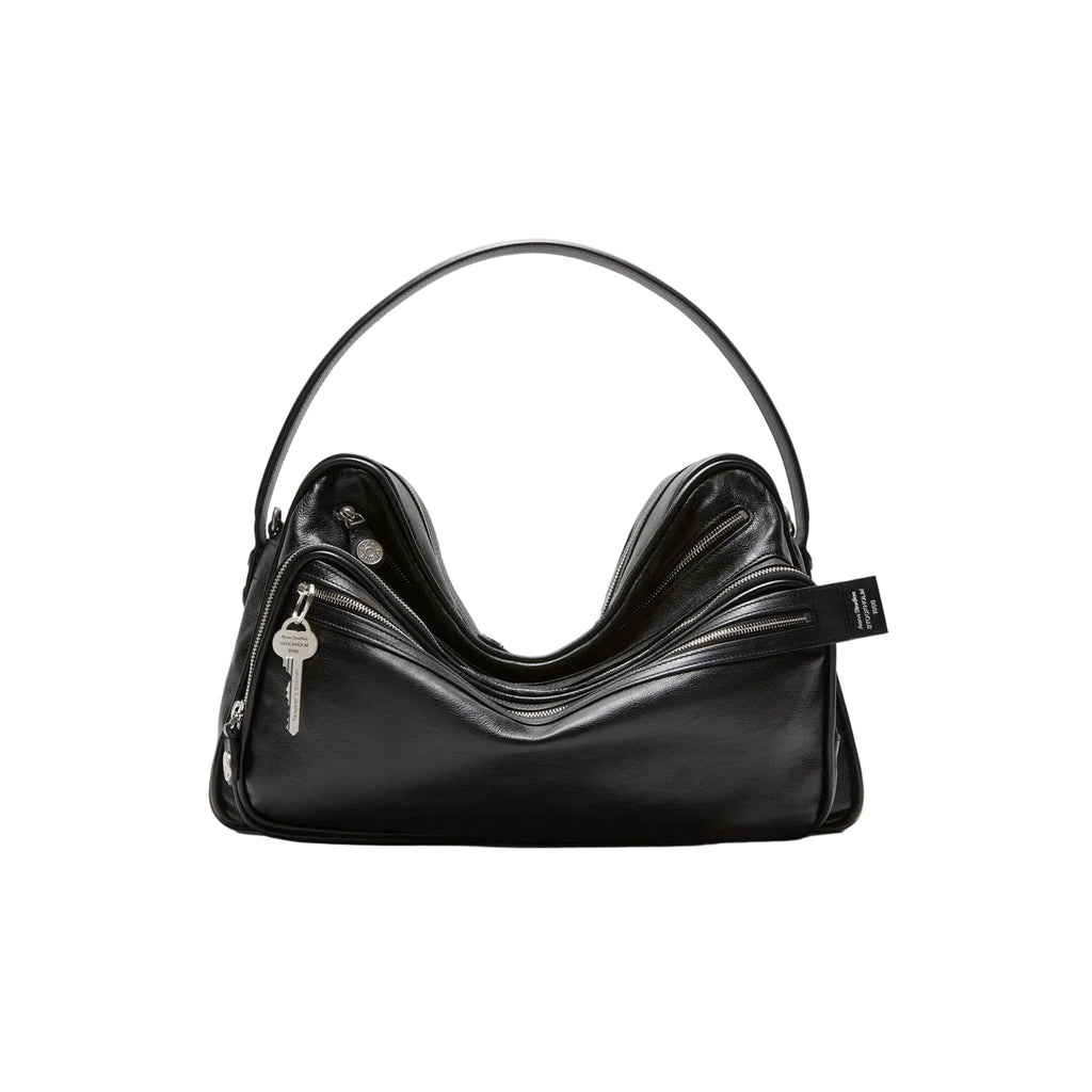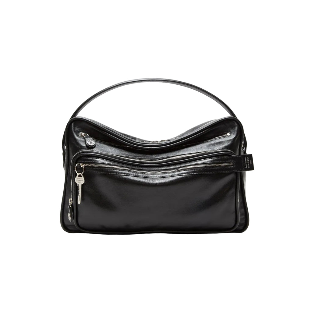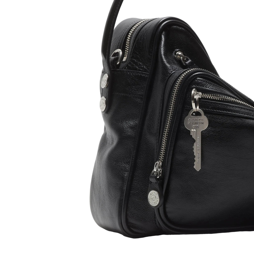 The Camero Camera Shoulder Bag by Acne Studios in Black features a distinctive multi-pocket design paired with a relaxed, collapsed silhouette, giving the bag a modern and effortless character. It is crafted with silver-toned metal hardware and detailed with zip compartments and denim-style buttons, adding a subtle utilitarian edge. The logo of Acne Studios is embossed on the silver foil, creating a refined signature finish. A branded key charm is also included. Designed for versatility, this bag includes a drop handle and adjustable crossbody strap, making it both functional and stylish for everyday wear.