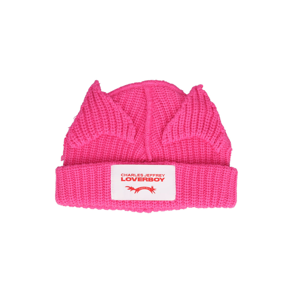 The Chunky Ears Beanie (Pink) by Charles Jeffrey Loverboy is a playful and iconic accessory featuring the brand's signature cat-ear design. Crafted from soft cotton, it offers lightweight comfort suitable for all seasons. A logo patch on the front and subtle metal details on the back showcase the brand's distinct flair, making this beanie a charming and fun addition to any outfit.