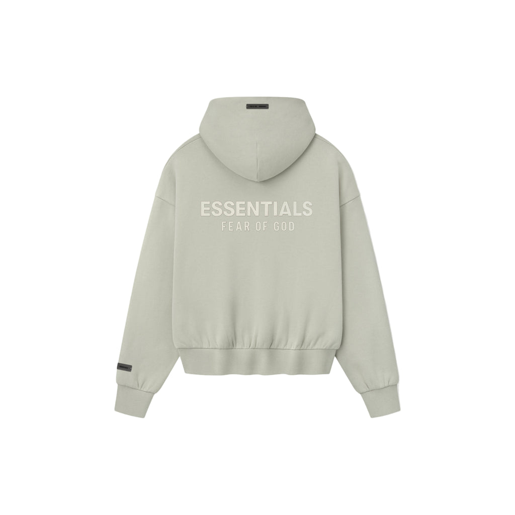 The Classic Full Zip Hoodie from Fear of God Essentials in Abbey Stone is crafted from heavyweight cotton-polyester fleece with a 380 GSM, providing both comfort and structure. It features the signature Essentials classic fit and relaxed proportions throughout the body and sleeves, with a beveled "Essentials Fear of God" logo on the back and translucent rubberized labels on the hood and sleeves. Additional details include a double-layered hood, rib-knit cuffs, waist hem, kangaroo pocket, and front full zip closure, combining timeless style with everyday functionality for a 6'2" figure wearing a medium size.