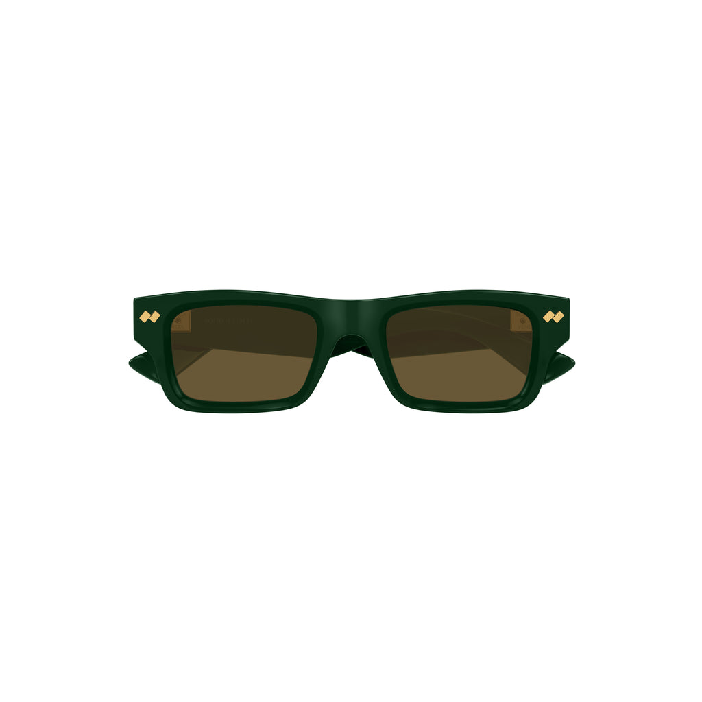 The Dizzy Square Sunglasses by Bottega Veneta in green feature a bold, masculine rectangular shape with refined detailing. Crafted from high-quality recycled acetate, the design is accentuated by a distinctive metal trim that mimics the look of two intertwining ribbons—a signature element of the brand's Ribbon line. A rounded bevel elegantly frames the lenses, adding depth and sophistication. These unisex sunglasses, part of the Spring/Summer 2025 collection, offer a striking balance of modern craftsmanship and timeless style with an international fit for versatile wear.