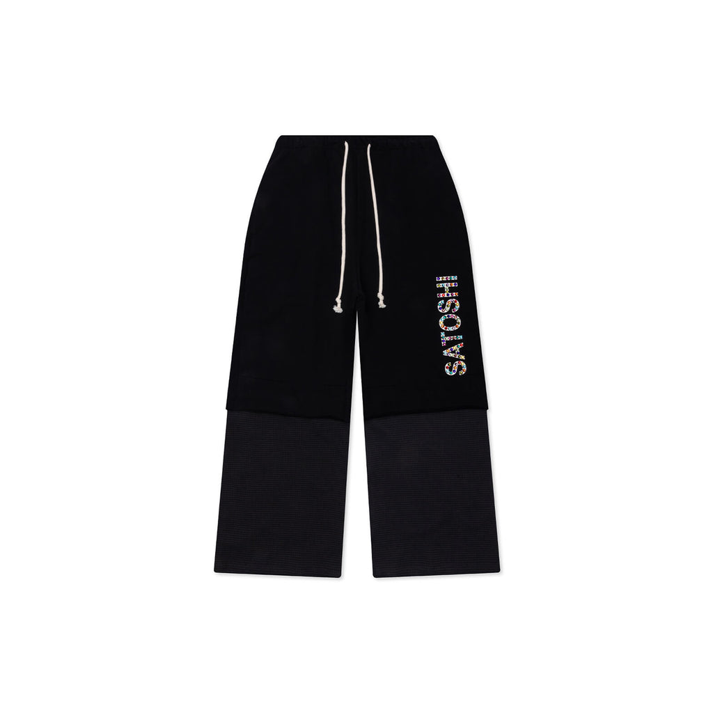 The Double Layer Studded Sweatpants by Satoshi Nakamoto, crafted from 100% cotton, feature a layered design with contrasting thermal fabric on the bottoms of the pants. They have an elastic waistband, drawstrings, side pockets, and a back pocket, combining comfort and functionality. These sweatpants are finished with screen-printed branding and colorful studs for a bold and signature look.