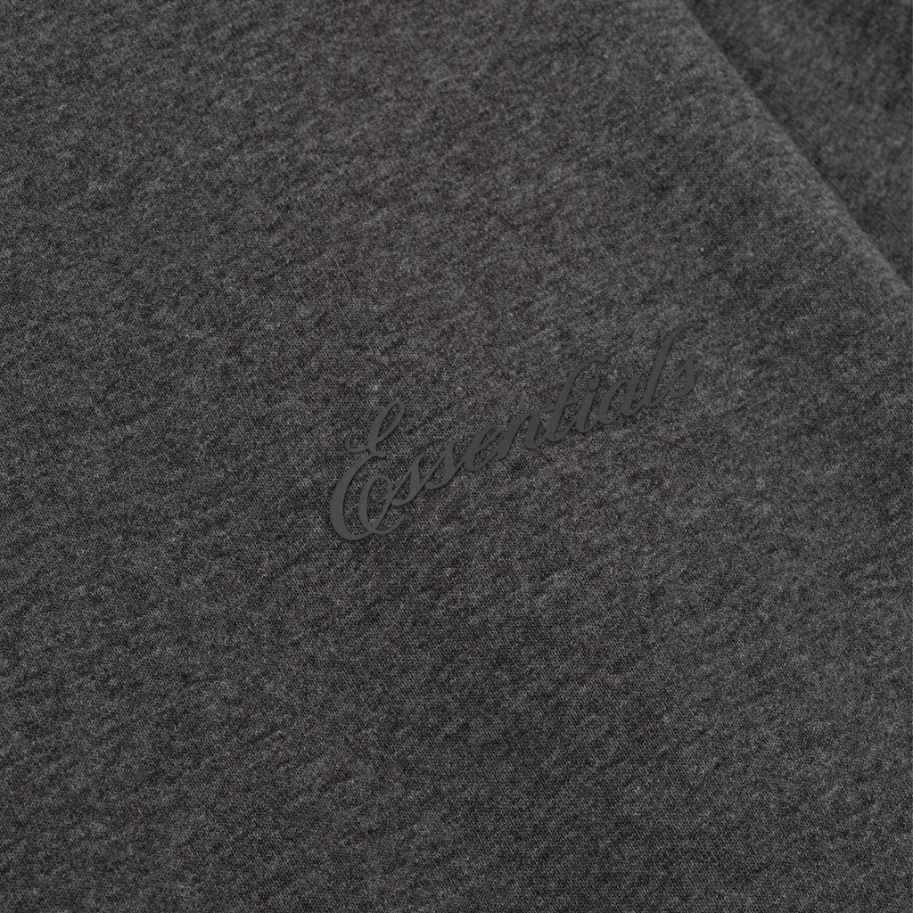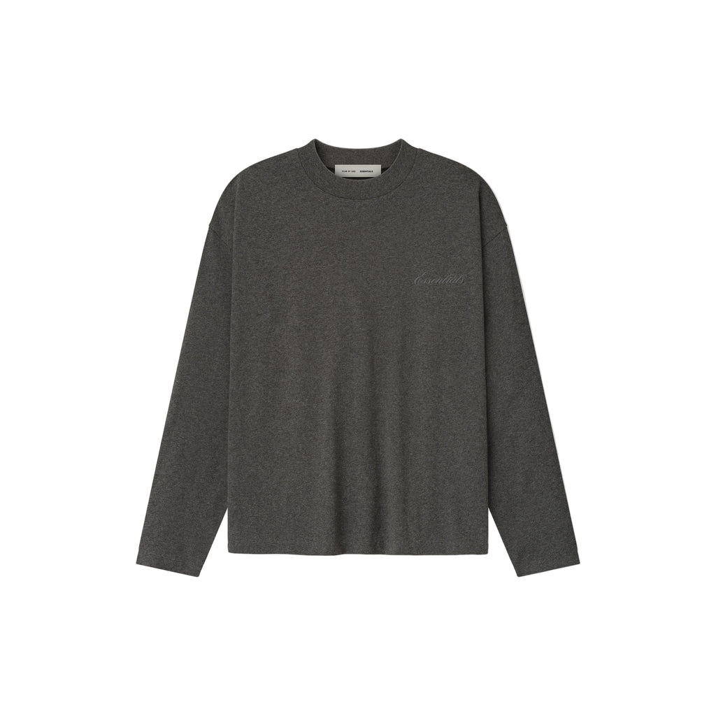The Fear of God Essentials Embroidered Classic Long Sleeve Tee in Charcoal Heather is made from medium-weight 100% cotton jersey with a relaxed, classic fit. It features a rib-knit crew neck and cuffs, an embroidered front logo, and a rubberized back label for a clean, minimalist look.