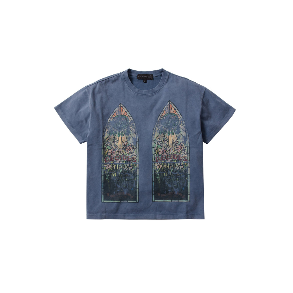 The Faded Jersey T-shirt from Who Decides War blends everyday comfort with artistic design. Crafted from 100% cotton, this tee features faded screen-printed stained glass motifs throughout, giving it a subtle, worn-in aesthetic. Designed with a boxy, slightly cropped fit, it delivers a modern silhouette while maintaining a relaxed and versatile style. The Vintage Grey colorway adds a soft, contemporary touch to this statement streetwear piece.
