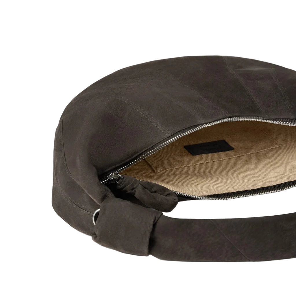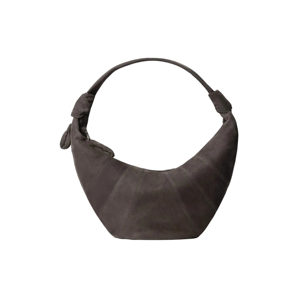 The Fortune Croissant Bag (Ebony Brown) by Lemaire is a refined and minimalist accessory defined by its elegant half-moon shape and deep ebony brown tone. Featuring distinctive topstitched cuts that highlight its sculptural design, the bag is complemented by a practical top handle and a functional D-ring detail for added versatility. A secure zip-top fastening keeps essentials safely stored, making it ideal for everyday use. Although new and unworn, the leather showcases Lemaire's signature specialised recovery and tanning process, resulting in a naturally soft texture with visible grain and subtle creases that enhance the uniqueness and character of each piece.
