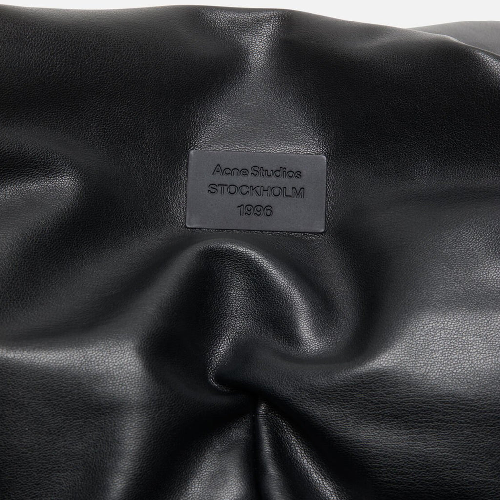 The Hooded Faux Leather Jacket from Acne Studios in black is crafted from grainy faux leather with a soft feel, combining a sleek look with everyday wearability. It features an elastic hem that creates a subtle gathered effect, complemented by ribbed cuffs and side pockets. A metal logo accents the hood, while a front zip closure and full lining ensure function and comfort. The jacket is made in Italy.