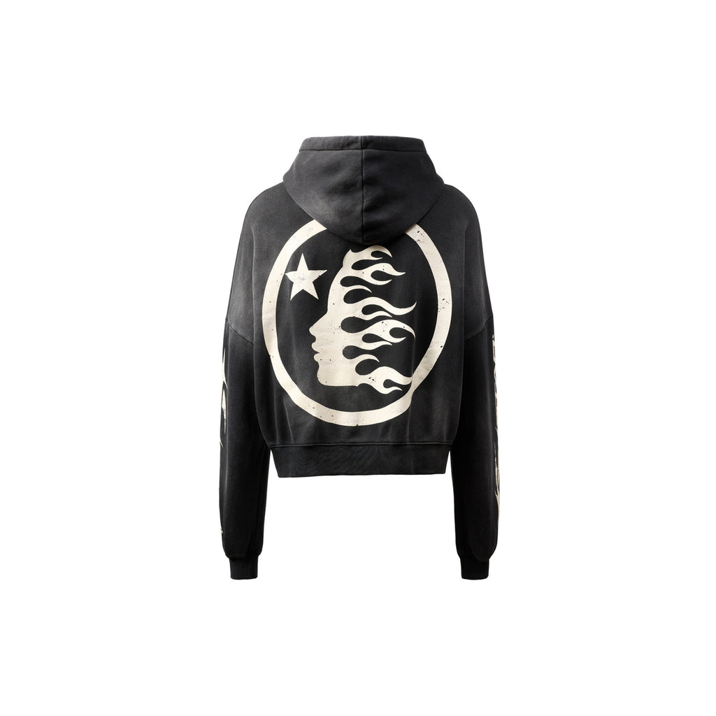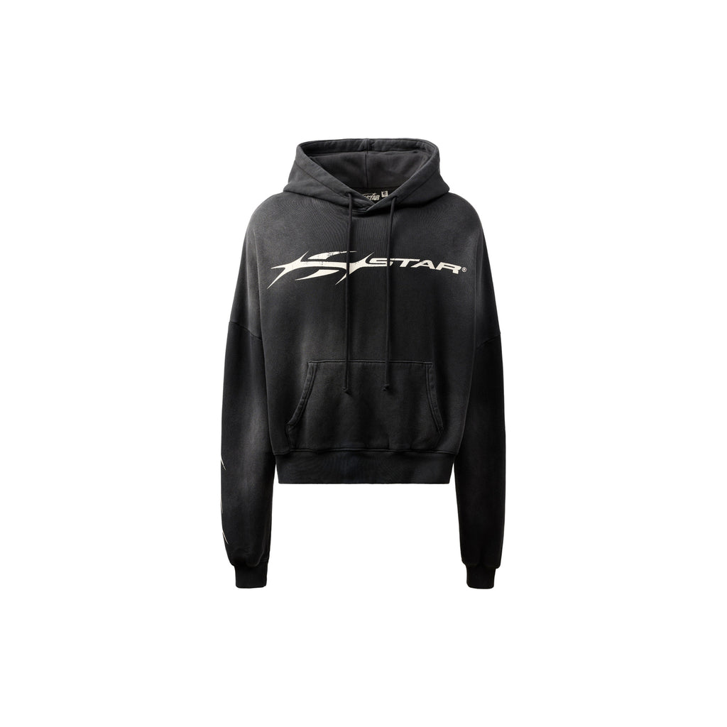 The Hstar Hoodie (Black) by Hellstar combines premium craftsmanship with bold streetwear aesthetics. It is made from custom-milled fleece fabric and has a vintage wash and potassium spray finish, giving the hoodie a naturally worn-in look and soft feel. This piece is fully manufactured in Los Angeles and reflects high-quality production and attention to detail. The signature HStar graphic is printed across the chest, back, and sleeves, creating a striking all-around design. With a slightly oversized fit, the hoodie offers relaxed comfort while maintaining a modern, effortless silhouette, making it a standout addition to any streetwear wardrobe.