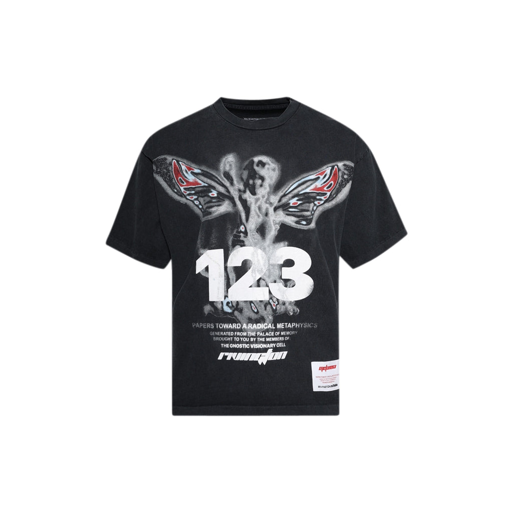 The In Times Like These CVA Tee (Black/Grey) by RIVINGTON roi Rebis is crafted from 100% medium-weight cotton jersey and designed with an oversized, boxy fit for a relaxed silhouette. Treated with a heavy stone wash, the tee offers a time-worn, ultra-soft feel that embodies effortless character. Screen-printed graphics on the front and back add a distinctive artistic touch, while a classic crew neckline and ribbed collar complete the look with subtle structure.