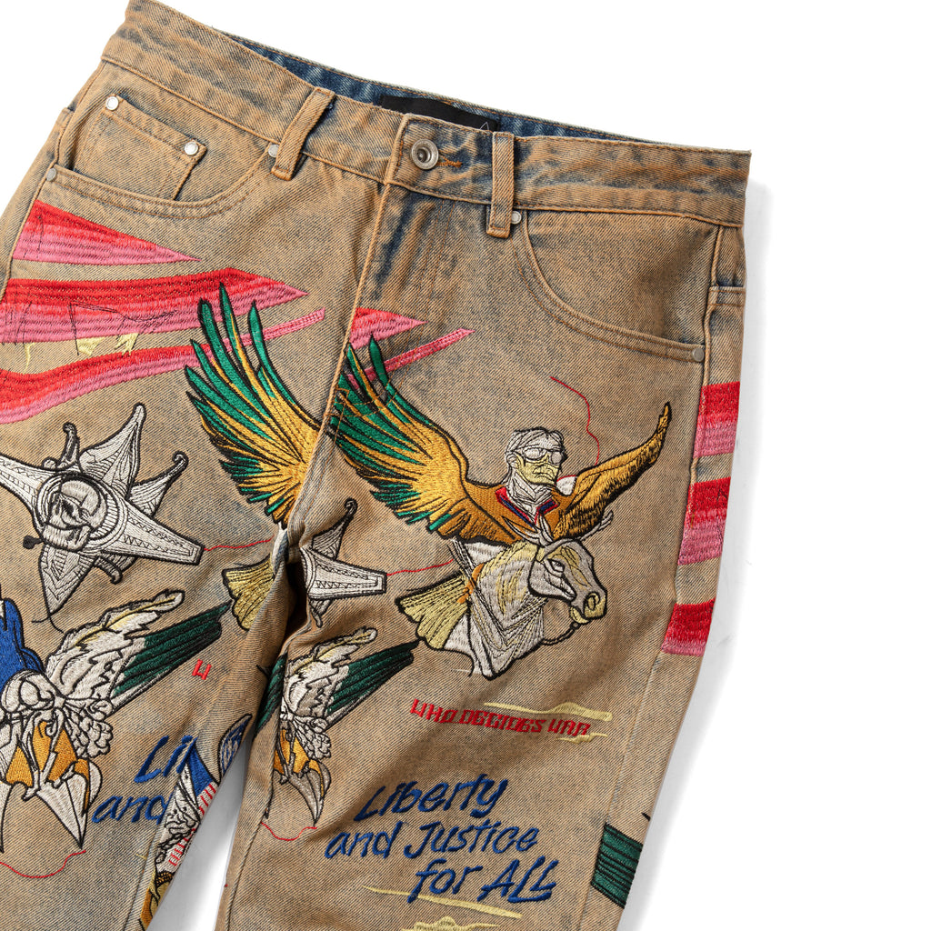 The Liberty Denim by Who Decides War is made from 100% cotton and has a slim fit for a clean and tailored silhouette. With a 35.5-inch inseam, these jeans have intricate embroidery detailing throughout, showcasing the brand's commitment to craftsmanship and storytelling. Available in the Tan/Denim colorway, they combine texture, contrast, and artistic design for a refined and expressive look. They fit true to size, so follow your usual size.