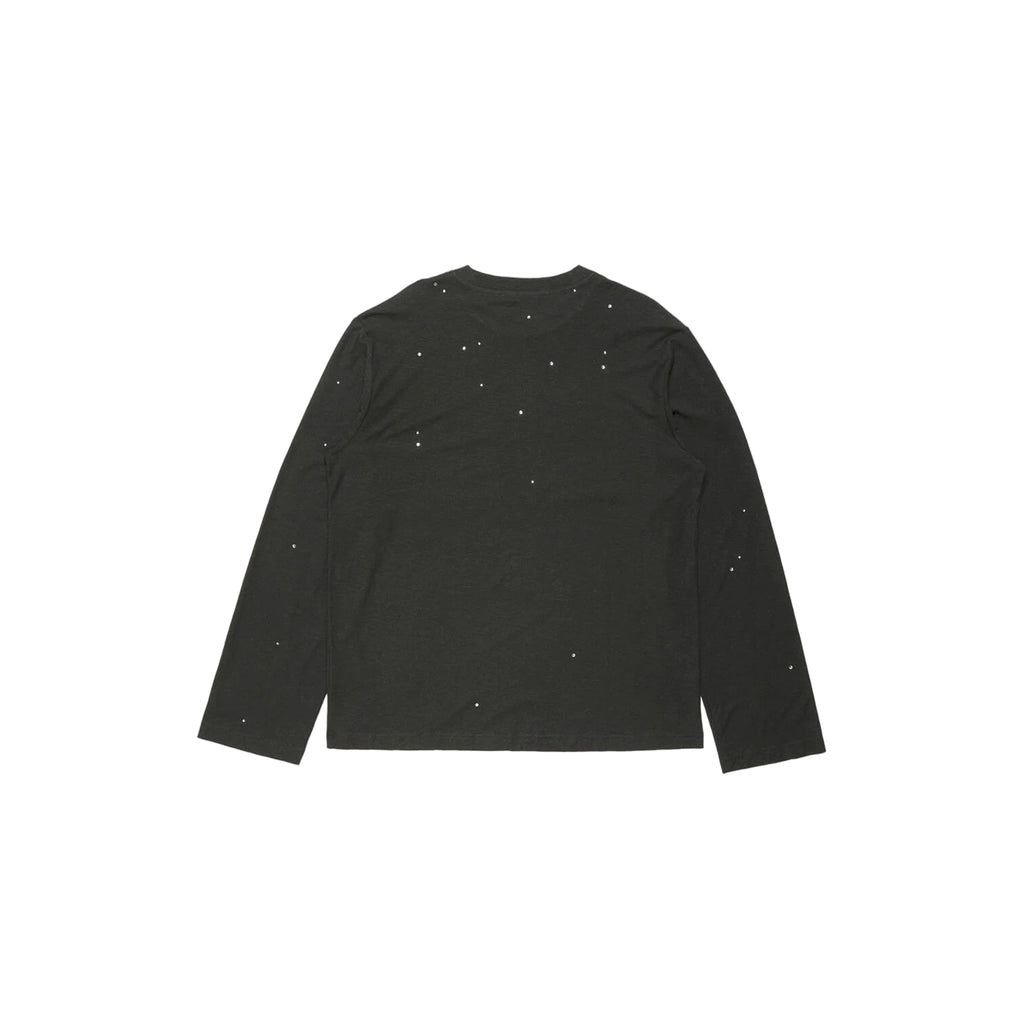The Logo Long Sleeve Crew Neck Tee (Black) by Acne Studios captures effortless modernity with a vintage-inspired edge. Crafted from lightweight cotton blend  jersey, this long-sleeved tee offers a soft, worn-in feel. The front features a metallic foiled "Acne Studios 1996" print accentuated with rhinestone details, adding a subtle touch of shimmer. Designed for a relaxed, unisex fit, the hip-length silhouette makes it a versatile piece that combines timeless comfort with an understated yet stylish look.