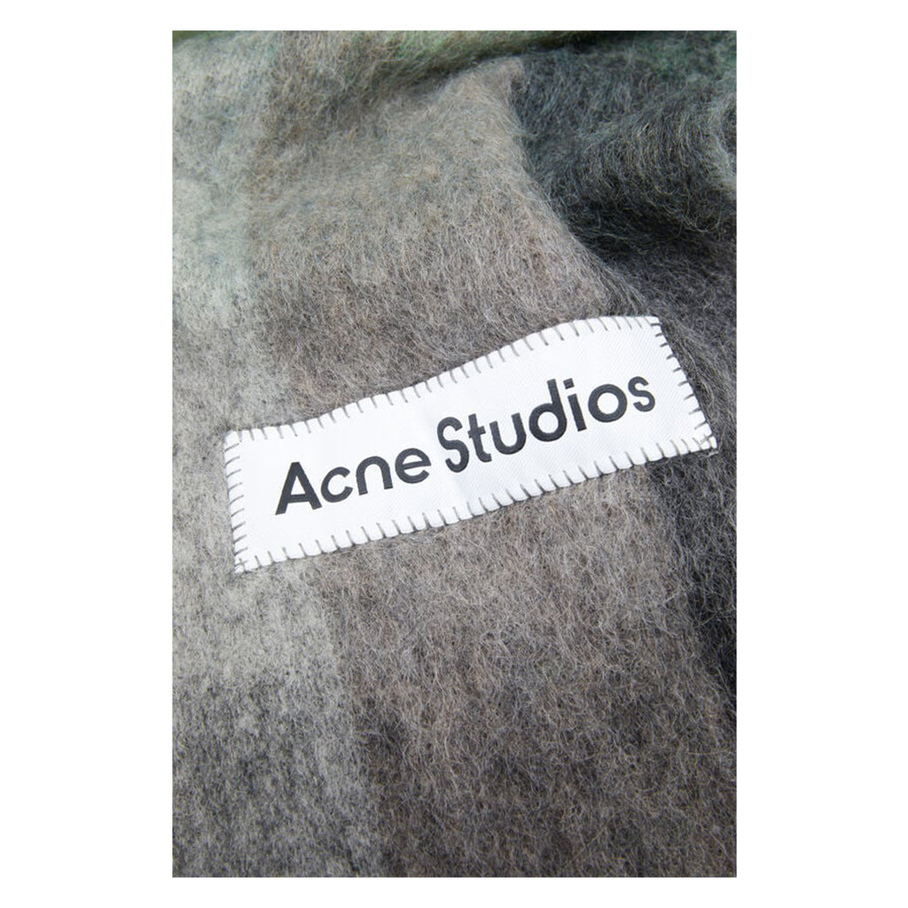 Acne Studios' scarf is made of a green, grey, and black checkered fabric with fringes. It has an embroidered label by Acne Studios, and it is crafted from a soft blend of wool and mohair.