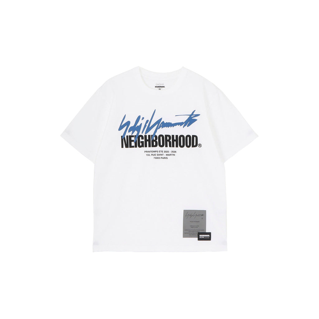 The Yohji Yamamoto x Neighborhood Tee SS-2 (White) is a short-sleeved T-shirt made of cotton plain stitch, with an original body design that emphasizes comfort and structure. It features a distinctive logo and graphic print, reflecting the collaborative edge between Yohji and Neighborhood. A branded tag on the left sleeve adds a subtle detail, while a one-wash finish enhances the texture and character of the fabric. This 100% cotton T-shirt was made in Japan with attention to quality and craftsmanship.