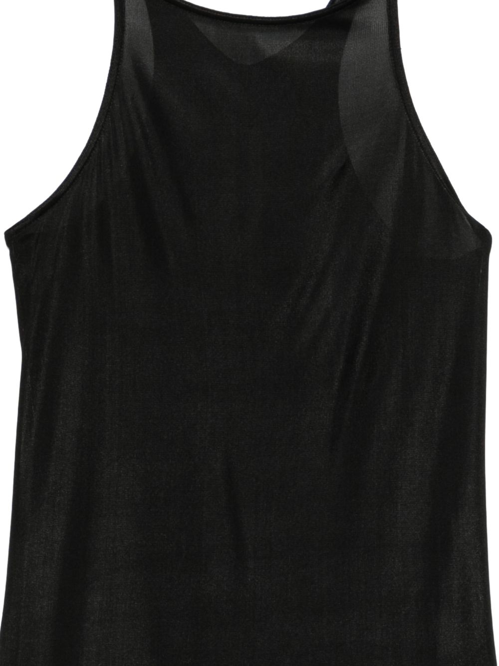 The Racer Back Tank Top (Black) by Rick Owens by DRKSHDW is a refined essential that embodies the brand's signature minimalist aesthetic. Designed with a hip-length, straight silhouette, this tank features a raw-cut hem, a round neckline, and thin shoulder straps that flow seamlessly into a racer-back construction. A single signature seam runs down the center of the back spine, adding a subtle architectural detail. Crafted from lightweight and fluid acetate jersey, the fabric offers a cool, soft handfeel, while a final heat-press treatment by Cinz gives the jersey a distinctive sheen, elevating the piece with a sleek, modern finish.