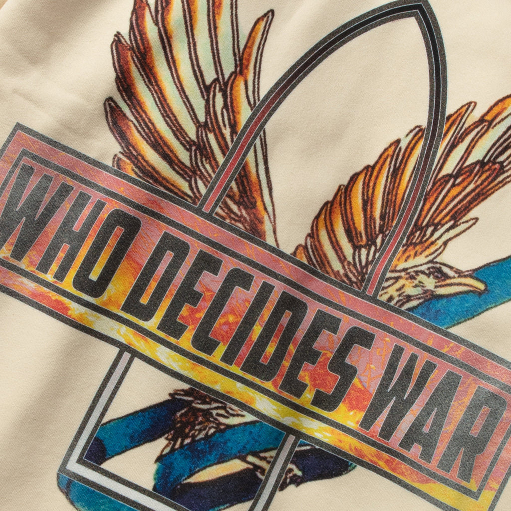 The Ribbon Tour Pullover in Cream by Who Decides War is crafted from 100% premium cotton and features a crewneck silhouette adorned with original screen-printed artwork. The thoughtful placement of the graphic design is complemented by intentional distressing, which gives the piece a unique, handmade feel. The pullover has a boxy, slightly cropped fit that keeps comfort without sacrificing style. To get the best look and feel, it is recommended to select your regular size.