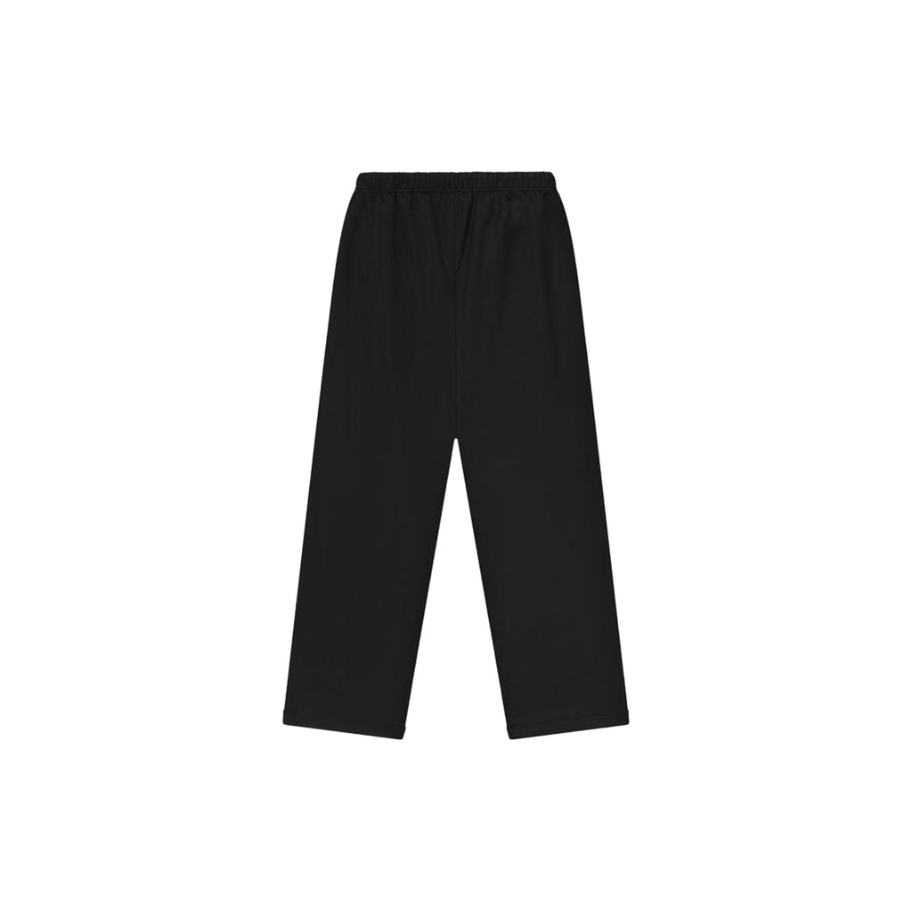 The Fear of God Essentials Satin Fleece Lounge Sweatpants in Vintage Black are crafted from heavyweight satin fleece with a wide-leg silhouette and 26 HD-printed graphics on the leg. They feature an elastic waistband with drawstrings, side pockets, and a center-front rubberized label, offering structured comfort and a modern streetwear style.