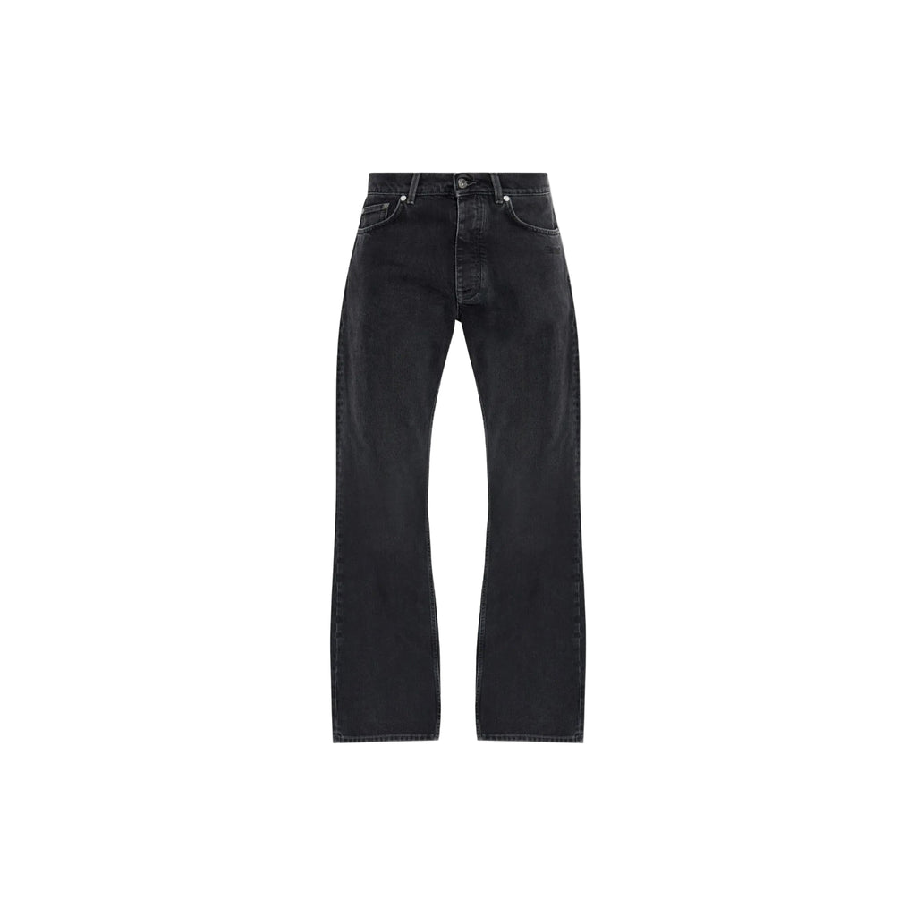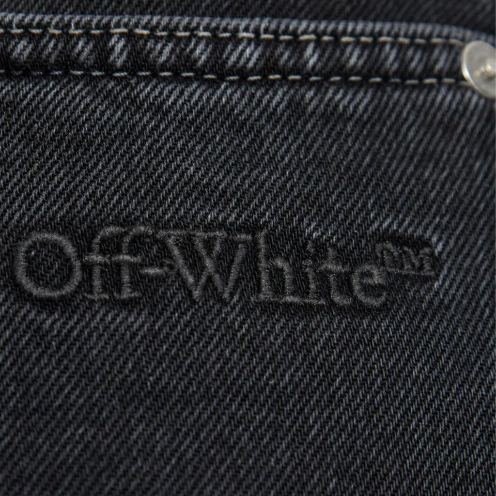 The Off-White Script Logo 90s Skate Jeans in Vintage Black reinterpret classic skate culture through a luxury lens. Crafted in Italy from premium denim, these pants feature a relaxed, wide-leg silhouette with traditional five-pocket styling, belt loops, and a button-and-zip closure. The vintage black wash enhances the 90's-inspired attitude, while subtle branding and expert construction deliver the elevated edge synonymous with Off-White.
