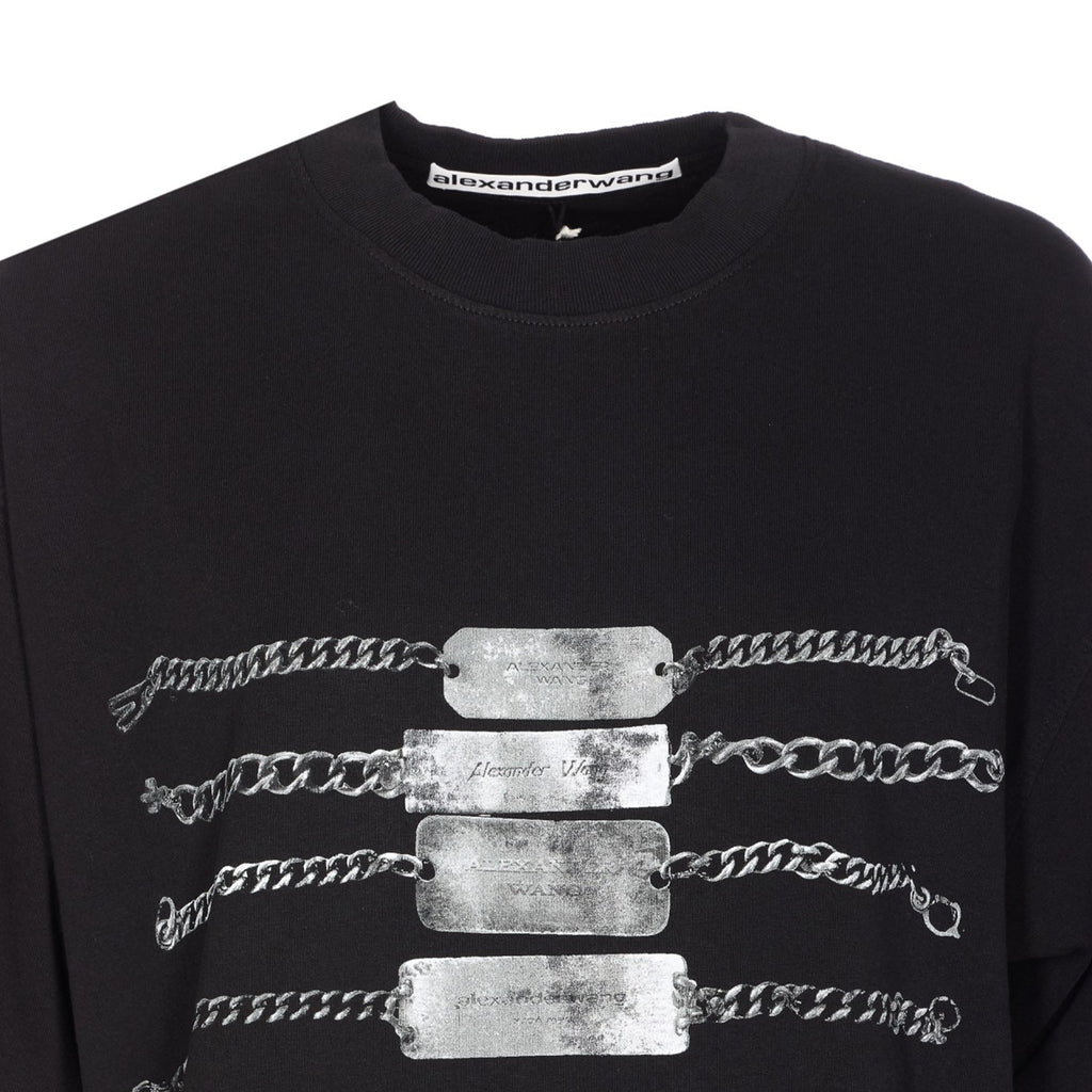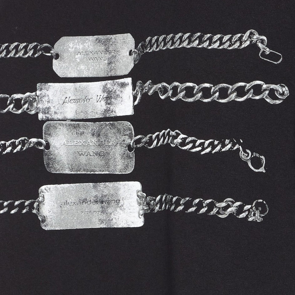 The Alexander Wang Short Sleeve Tee with Chain Graphic in Black is a stylish T-shirt with a crew neckline, crafted in Italy. It features short sleeves and a bold graphic print with chain details on the front, made from high-quality materials. It offers a comfortable fit for everyday wear and adds a modern and edgy touch to any casual look.