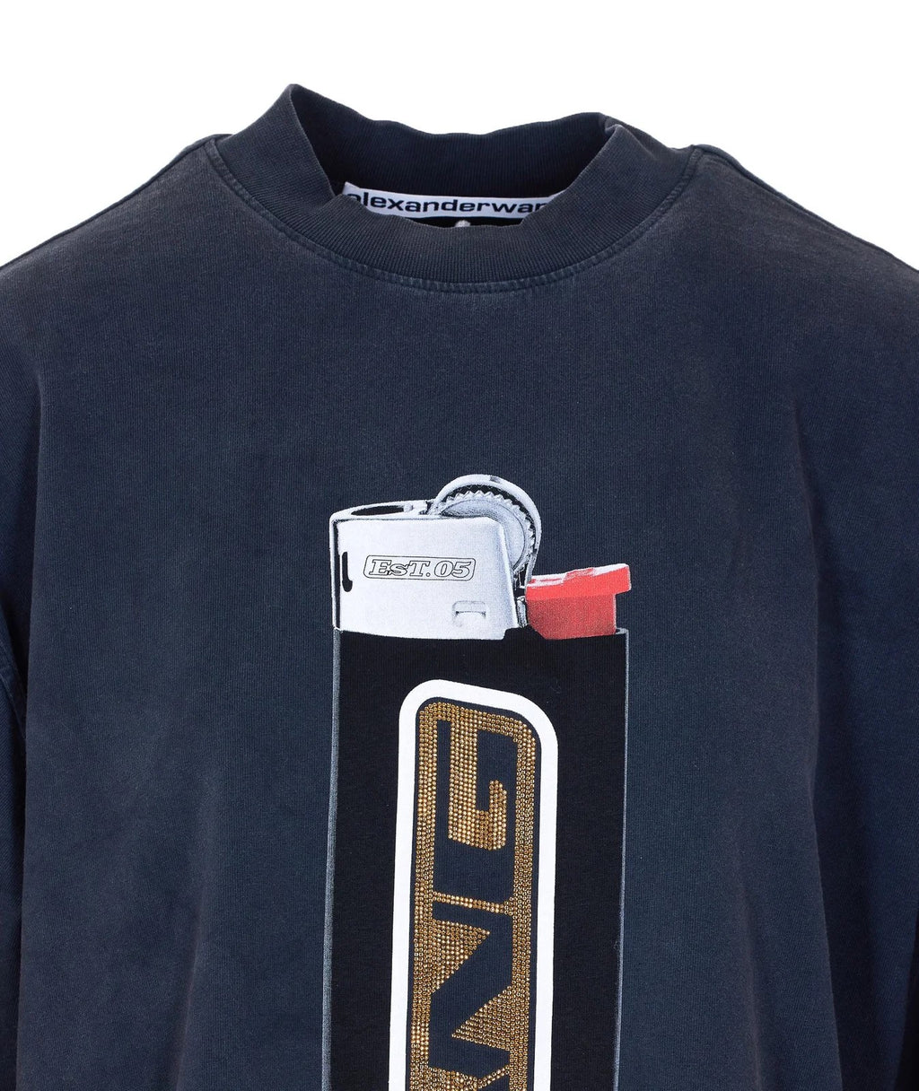 Short Sleeve Tee W/ Lighter Graphic (Washed Black) by Alexander Wang is a modern casual essential with a signature washed finish. Designed in an oversized silhouette, it features short sleeves, a ribbed crewneck, and ribbed trims for a clean, structured outline. The chest is detailed with a central lighter graphic elevated by rhinestone embellishment, adding a subtle design accent without compromising versatility. Crafted in Portugal, this t-shirt reflects Alexander Wang's minimalist, detail-driven approach to everyday wardrobe staples.