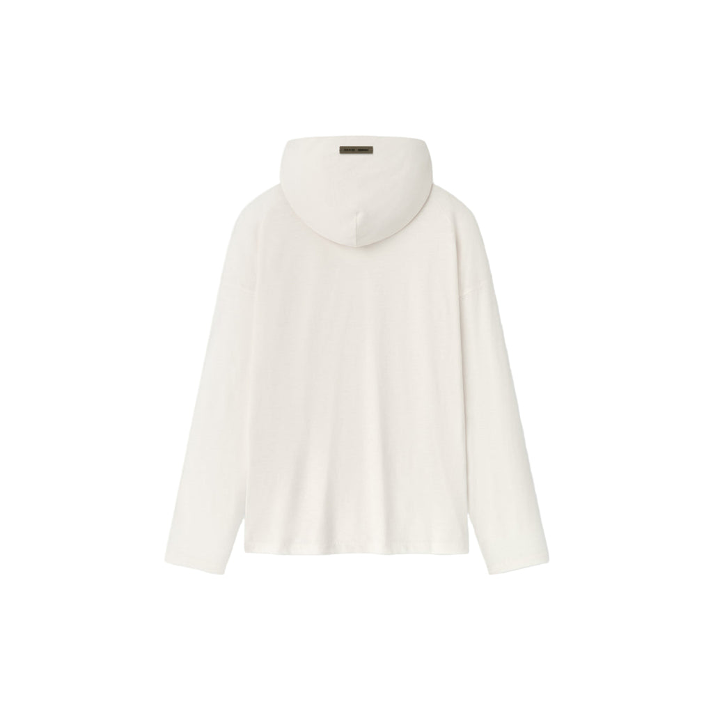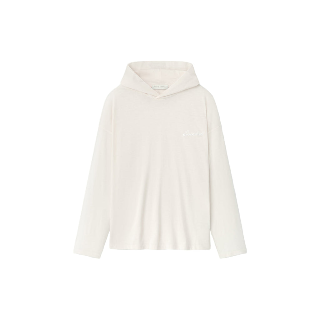 The Fear of God Essentials Women's Embroidered Classic Hooded Long-Sleeve Tee in Ivory is made from lightweight cotton-poly jersey for a soft, airy feel. Featuring a relaxed fit, rib-knit cuffs, and a functional hood, it's finished with an embroidered Essentials logo on the front and a Fear of God label at the back collar for a clean, versatile look.