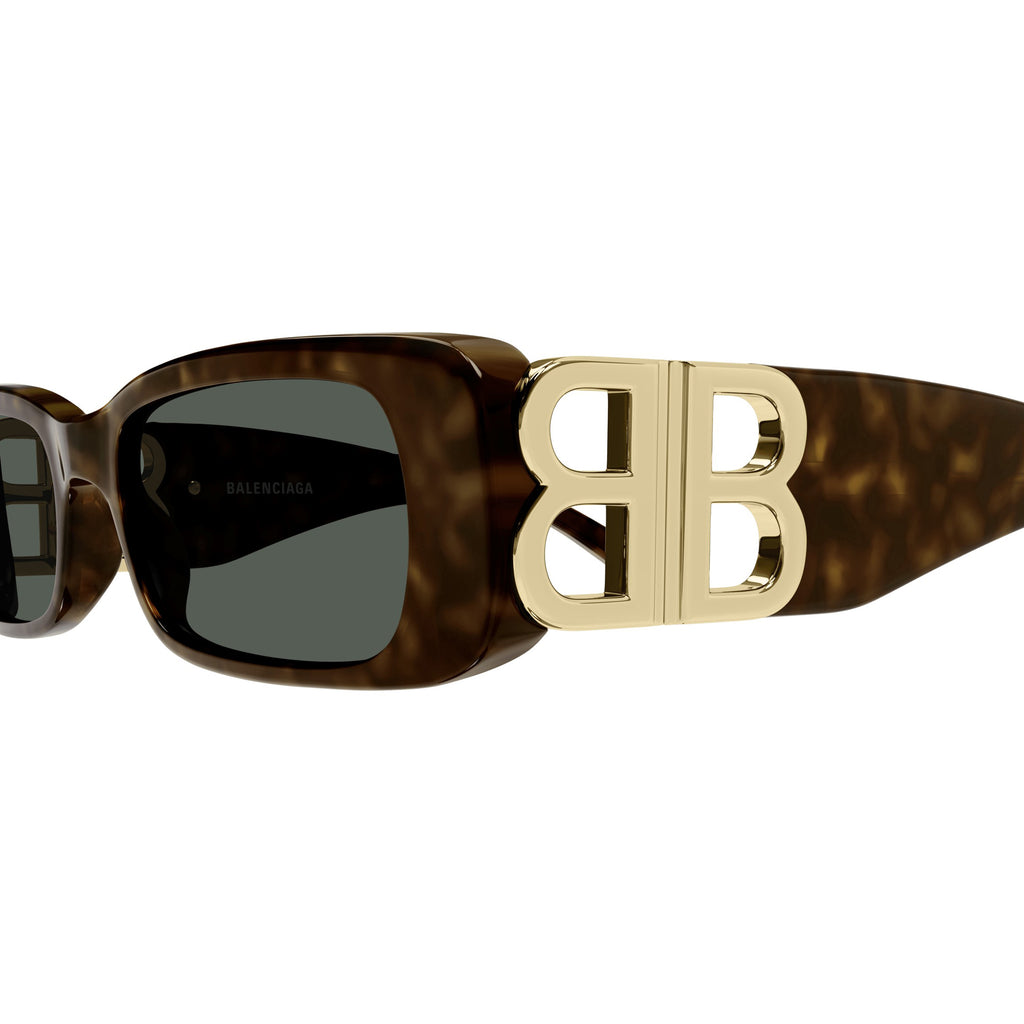 The BALENCIAGA  Dynasty Rectangle Sunglasses have a bold rectangular shape and a sleek havana and gold acetate frame. They offer a modern take on classic luxury, with grey lenses that provide a sharp contrast and ensure everyday UV protection. Crafted expertly in Italy, they reflect Balenciaga's commitment to refined aesthetics and premium quality.