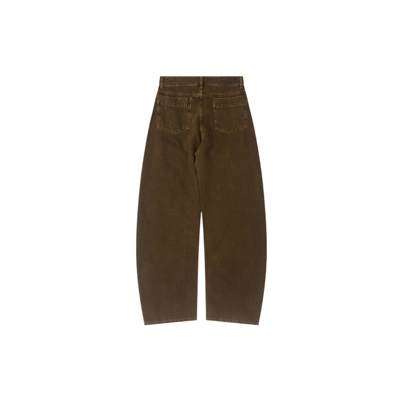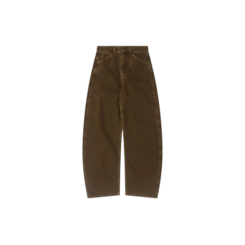 The Women's High Waisted Curved Pants in Moss Green by Lemaire is a signature piece crafted from thick, garment-dyed denim with a unique snowy patina finish. Featuring a high waist and distinctive curved cut, these pants combine classic tailoring with modern style. They offer both comfort and functionality, with belt loops for secure closure, hooks, buttons and a hidden zipper. Western-style front pockets, ticket pocket, and back patch pockets add to their timeless appeal. Tone-on-tone topstitching and Lemaire's embossed leather Jacron at the back complete the refined look, made in Morocco from 100% cotton.
