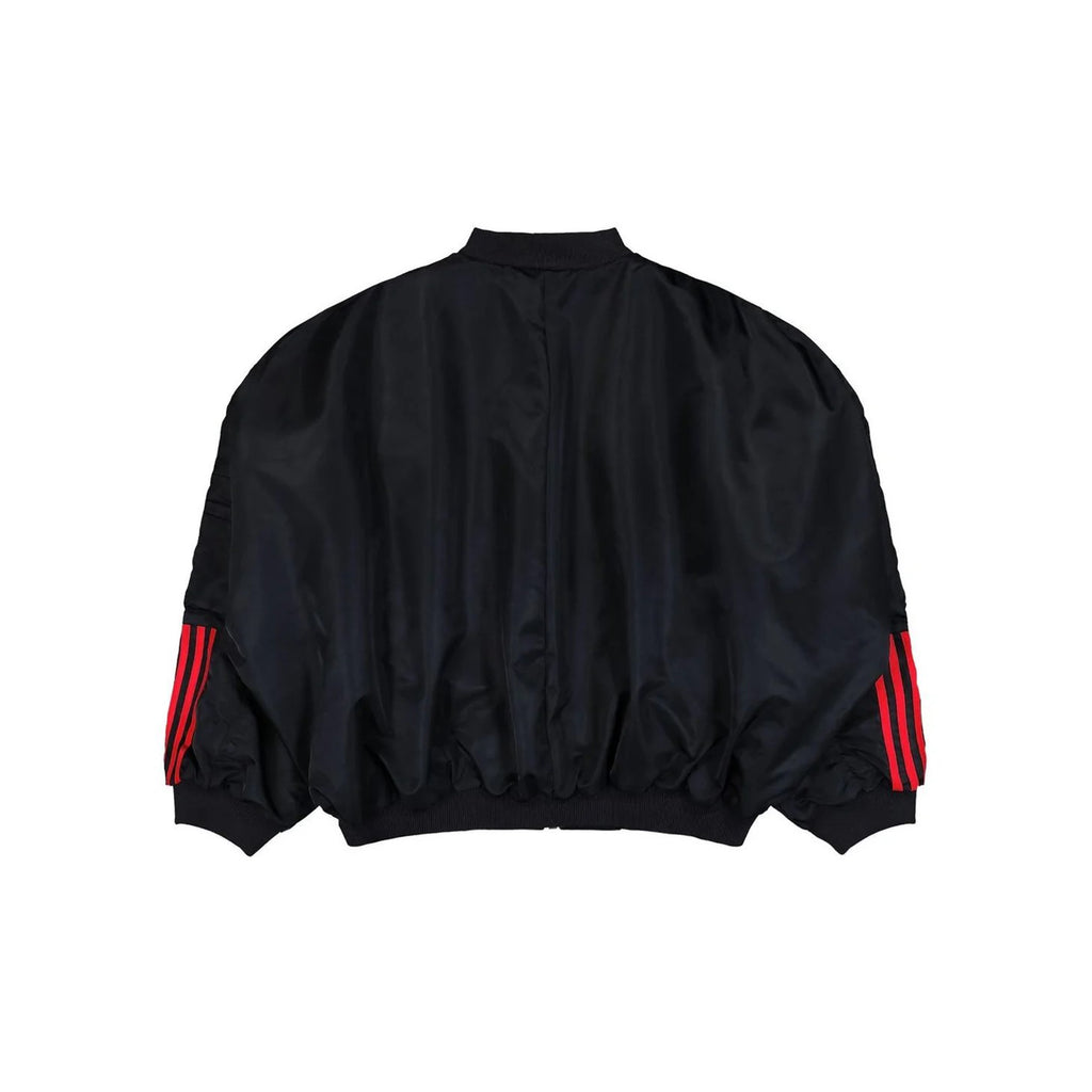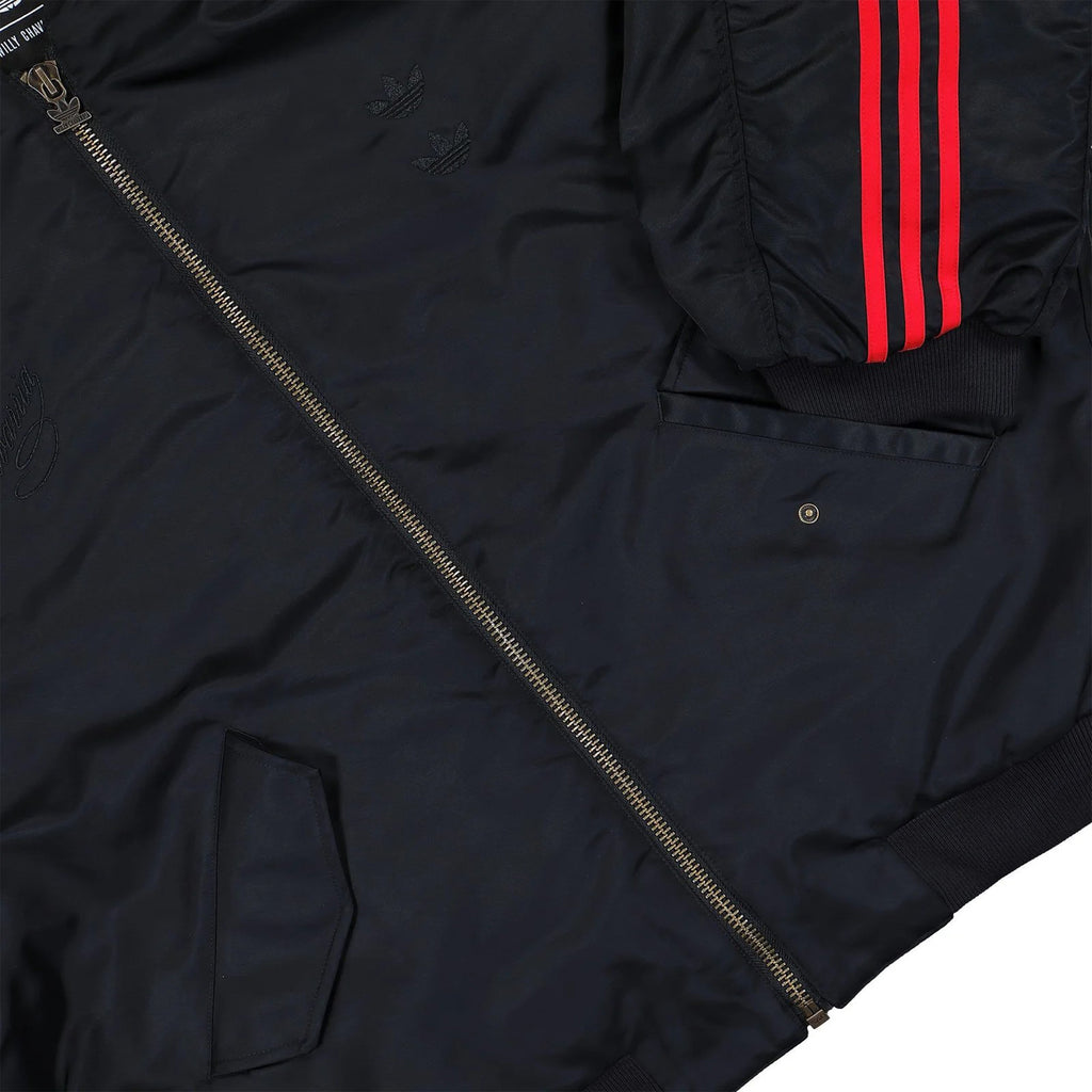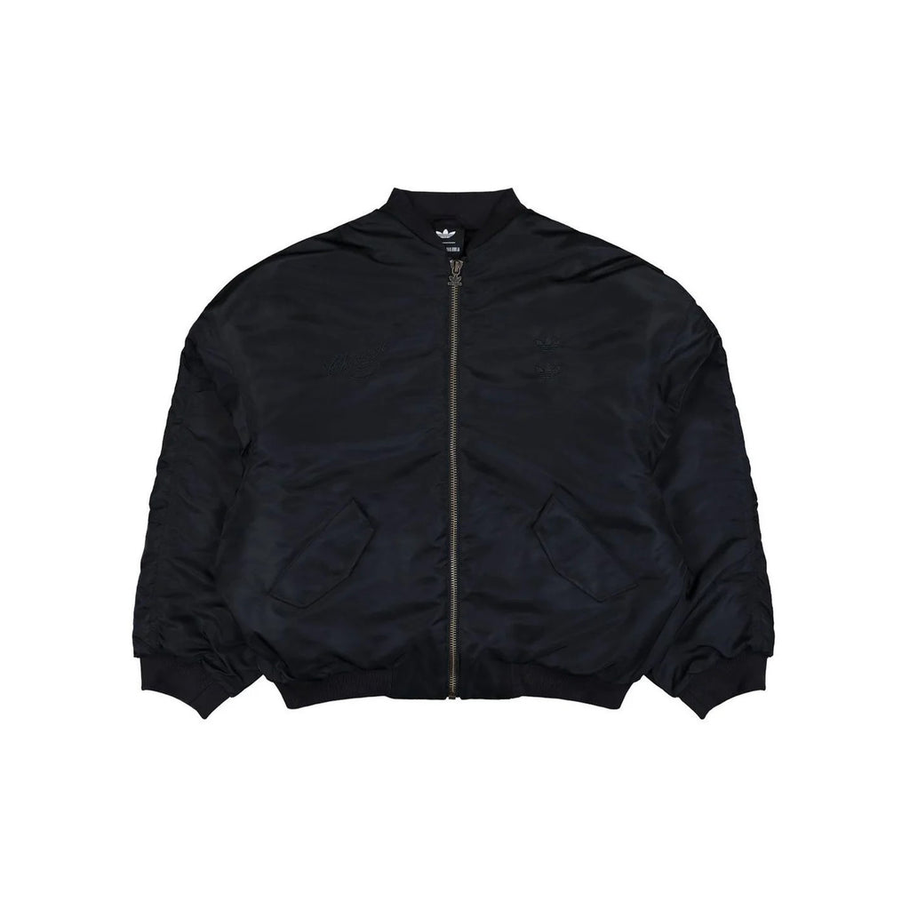 The Willy Chavarría x adidas Satin Bomber Jacket (Black) combines classic bomber style with modern, elevated details, featuring a smooth, satin-like finish and a premium gold zipper for a luxurious, yet street-ready look. The signature adidas striping on the sleeves and the collaborative embroidery enhance the design, creating a bold and refined outerwear piece that embodies the dynamic fusion of fashion and sports.